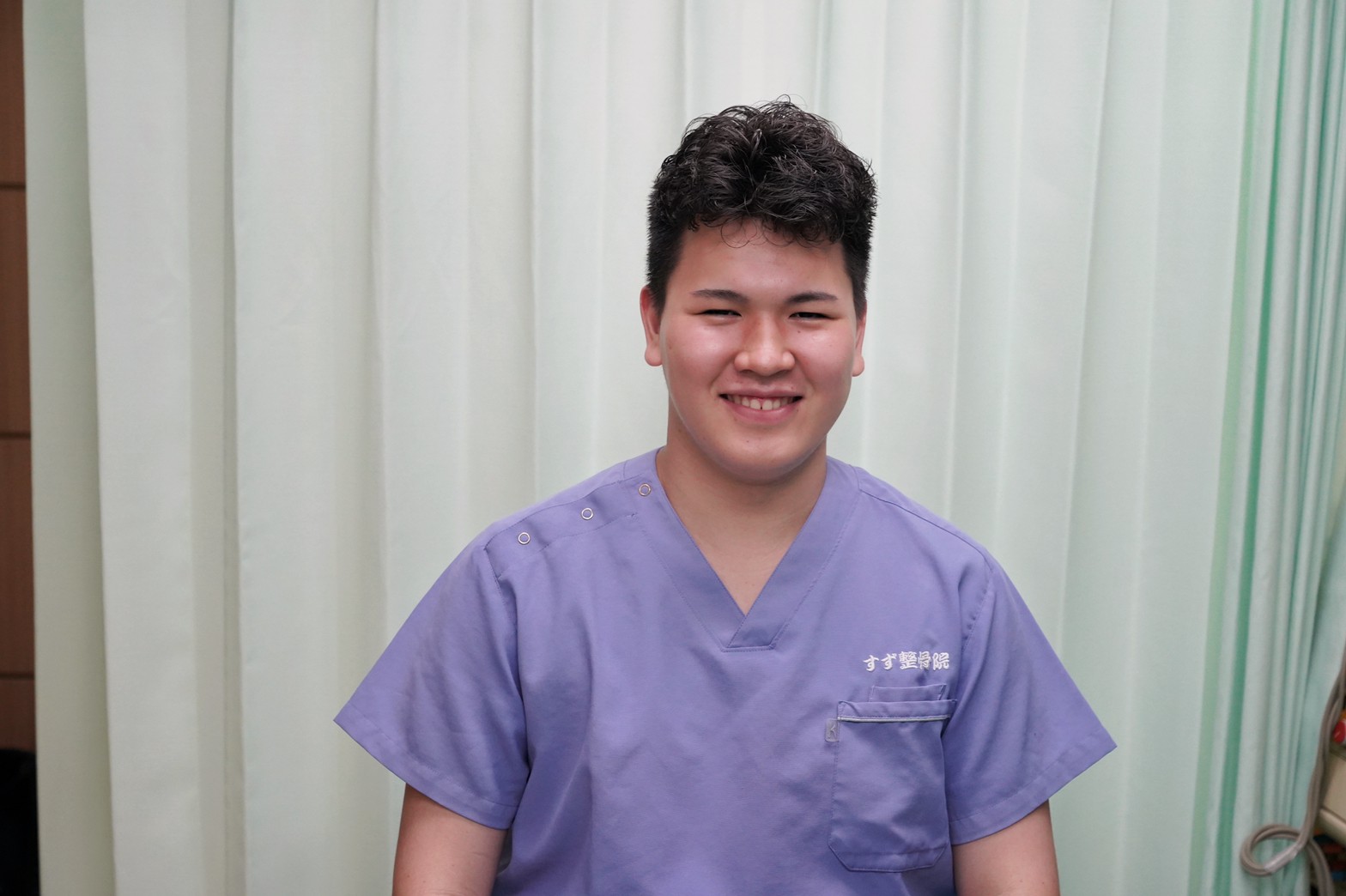 中学生の時にすず先生にけがを早く治してもらってからこの仕事を目指すようになりました。現在は学生に運動フォームや運動後のケアなどを教えてあげています。 常に笑顔で明るく元気に、思いやりを持って、日々取り組んでいます。
